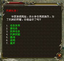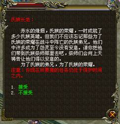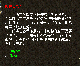 领取:氏族任务发布后会有消息提示,一小时内该氏族的成员可在发布氏族任务的氏族长老处领取氏族任务