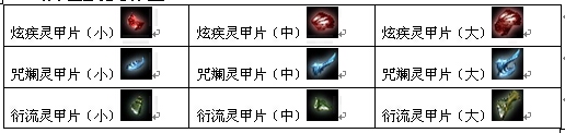 小碎甲片、中碎甲片、大碎甲片对应可以开光为小灵片、中灵片、大灵片。