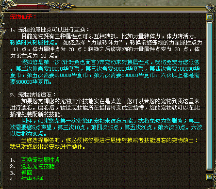 玩家可去华夏城中心(628,980)“宠物仙子”处对自己的宠物进行属性点转换、技能遗忘。(如图)