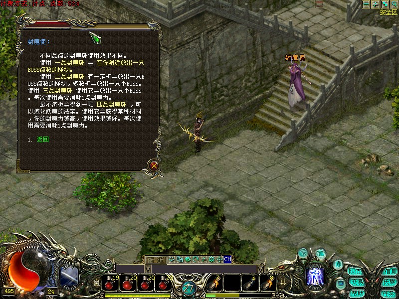 使用三品封魔珠,会在使用者附近放出一只小BOSS