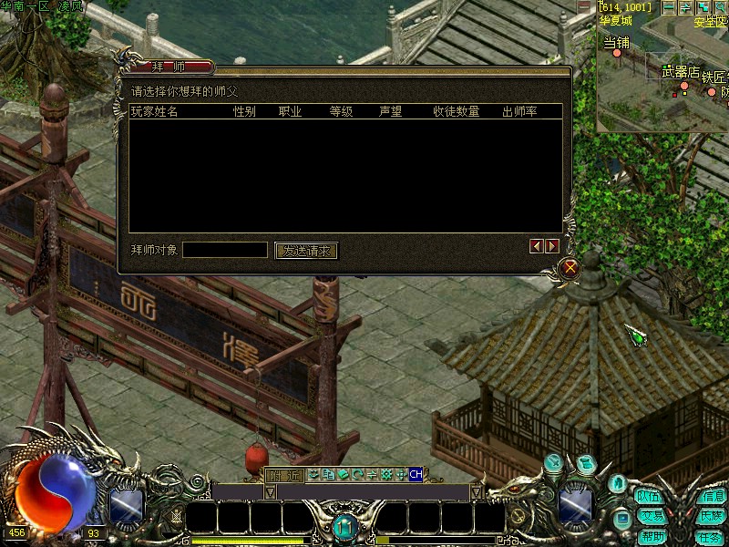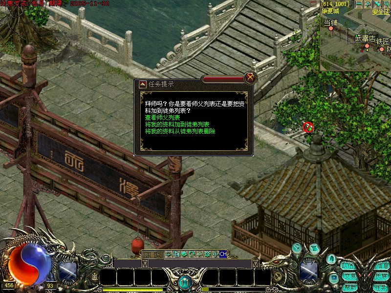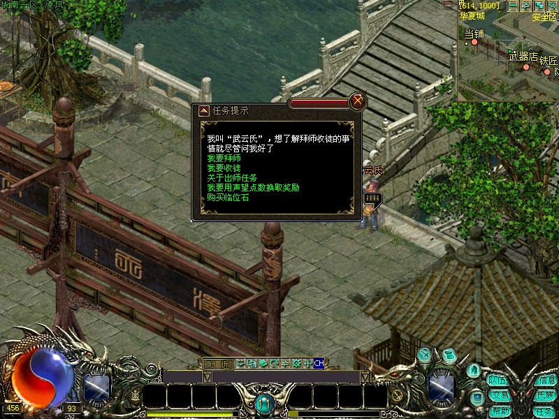 师徒系统需要找华夏城中心广场的NPC武云氏(629,981)实现,在武云氏处可以进行拜师、收徒弟、解除师徒关系的操作。